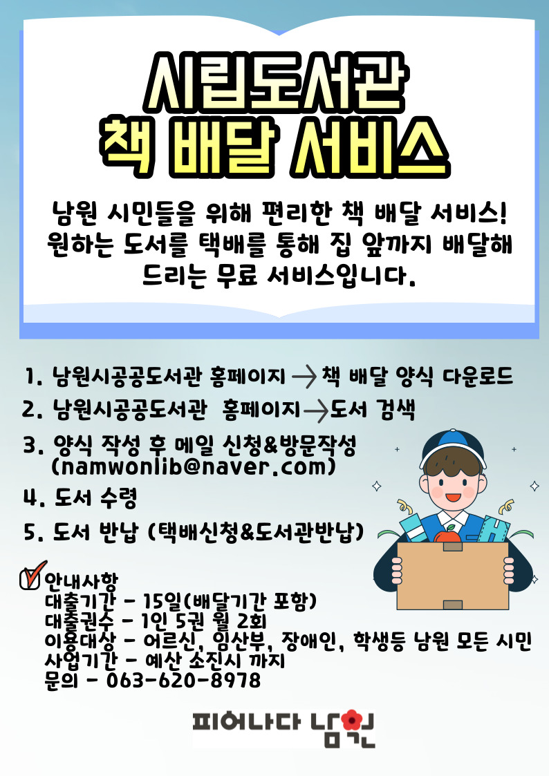 - 이메일 : 홈페이지에서 책 배달 서비스 신청서[별첨1] 다운로드 후, 이메일(namwonlib@naver.com) 신청