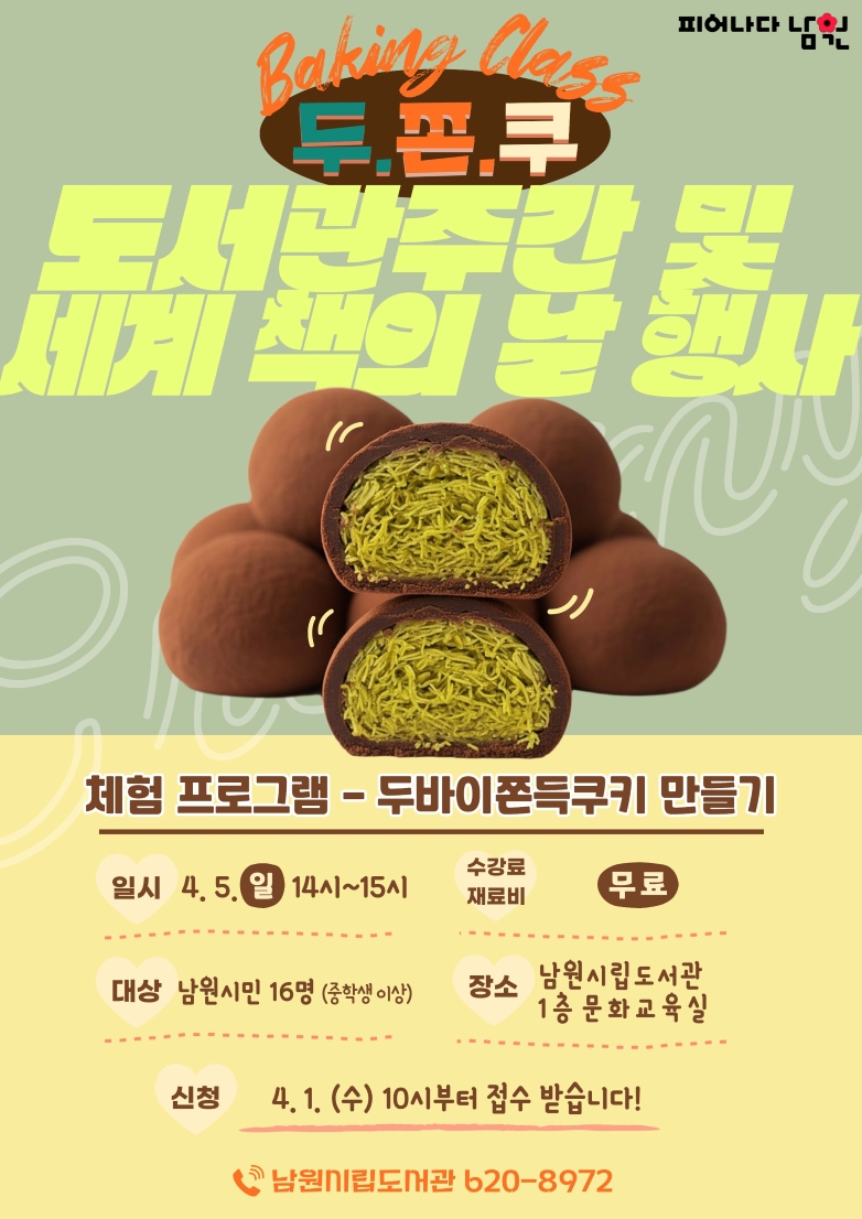 2026 도서관주간 및 세계책의날 행사 [체험 프로그램: 베이킹클래스-두바이쫀득쿠키 만들기]